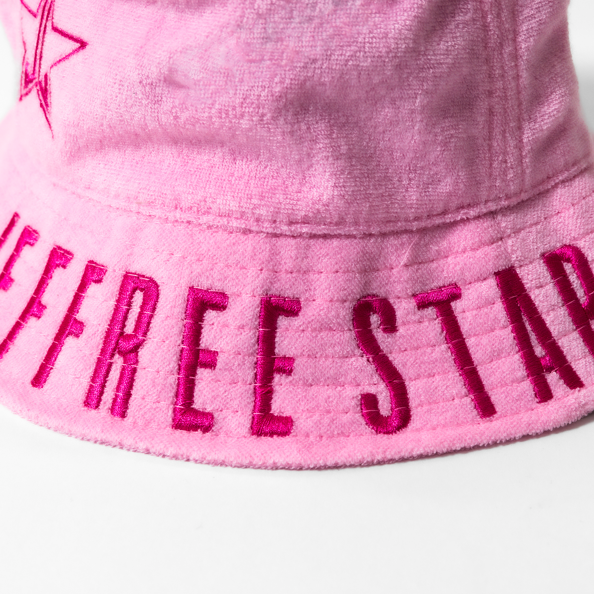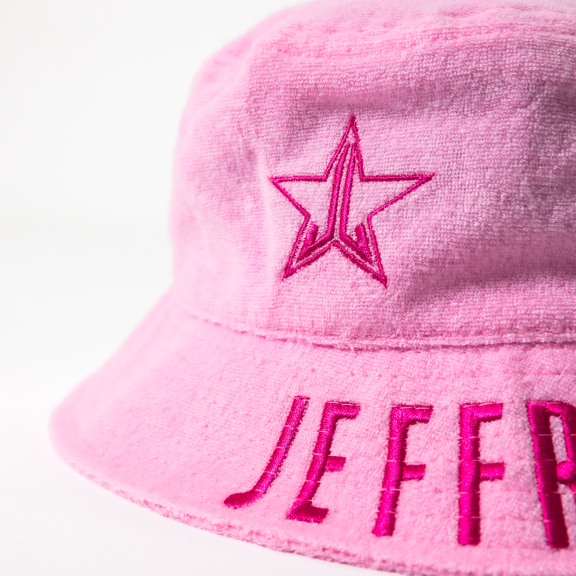 A cute and stylish bucket hat featuring premium embroidered details. Front facing Jeffree Star Cosmetics logo and Jeffree Star embroidered on the brim of the hat. One size